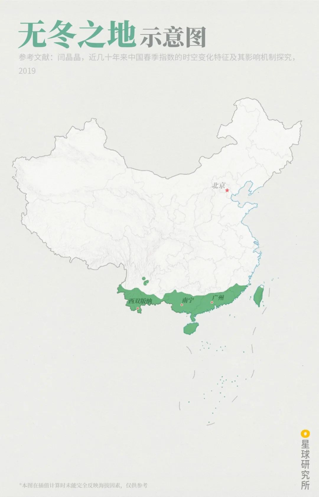 而云南中部更是四季如春它们皆是中国的无冬之地也是中国春天最早到来的地区(无冬之地,制图@巩向杰&赵榜/星球研究所)▼
