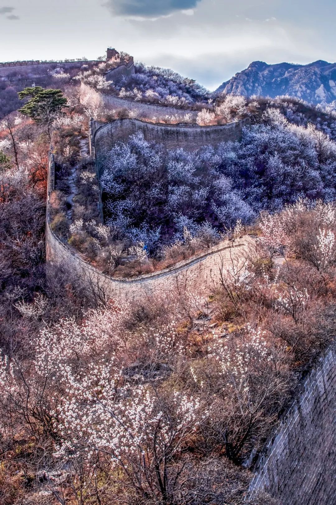 3月28日玉兰和连翘几乎同时进入始花期(长城的山桃花花海,拍摄于北京怀柔县九渡河镇撞道口村,摄影师@大张张;因为气候变暖等原因,近年北京的花期普遍提前,本文中的花期仅作参考)▼