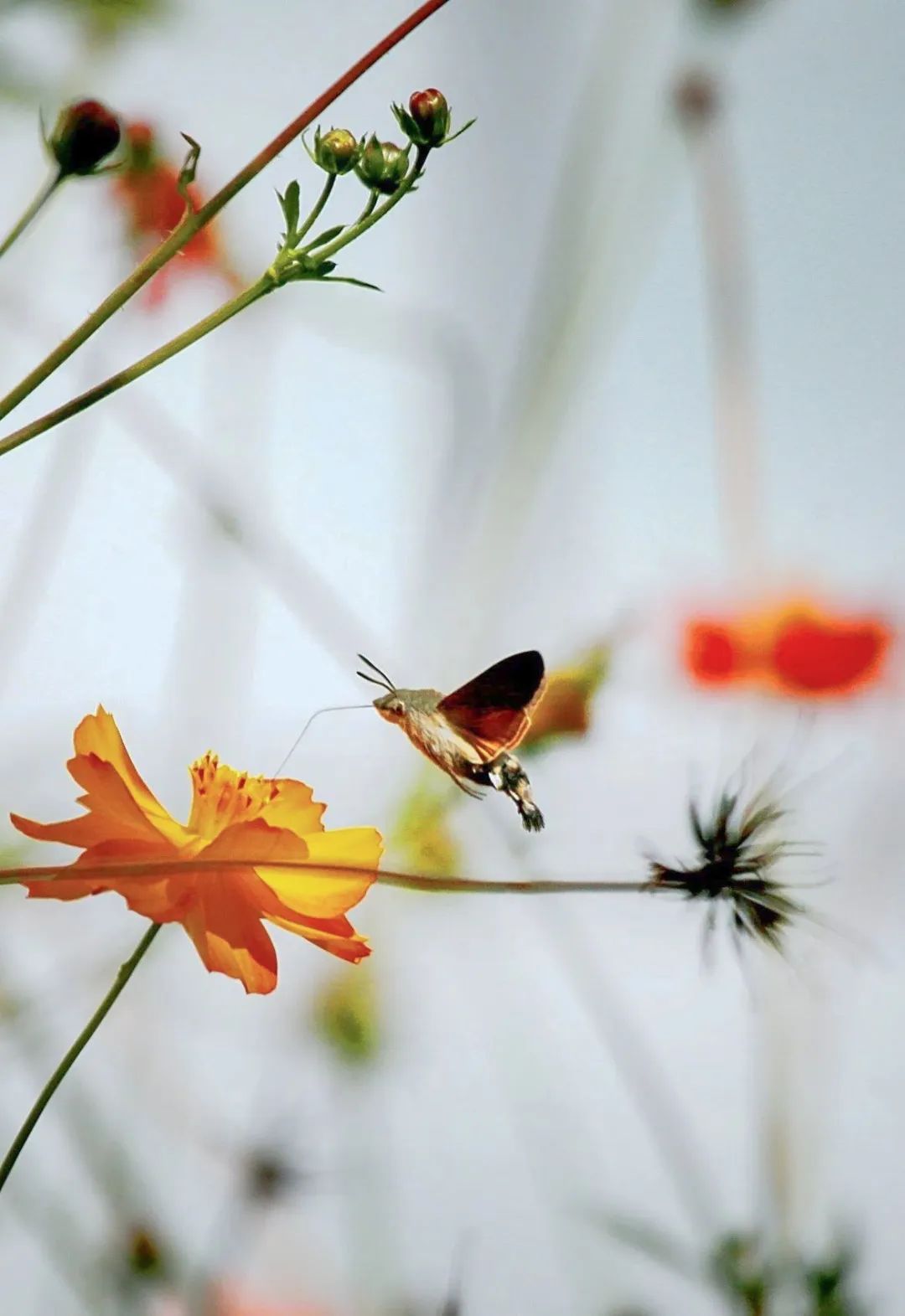 这个花花世界为更多生命提供了机遇昆虫飞舞(吸蜜的蜂鸟鹰蛾,喝奶茶自带吸管,植物为黄秋英,也叫硫华菊,摄影师@张波)▼