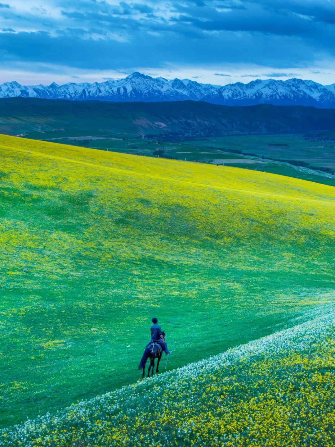 但就凭这些微小的生命足以营造出无数花海黄的(请横屏观看,新疆巩留县吉尔格郎乡萨尕草原,黄花为西伯利亚离子芥,摄影师@姜曦)▼