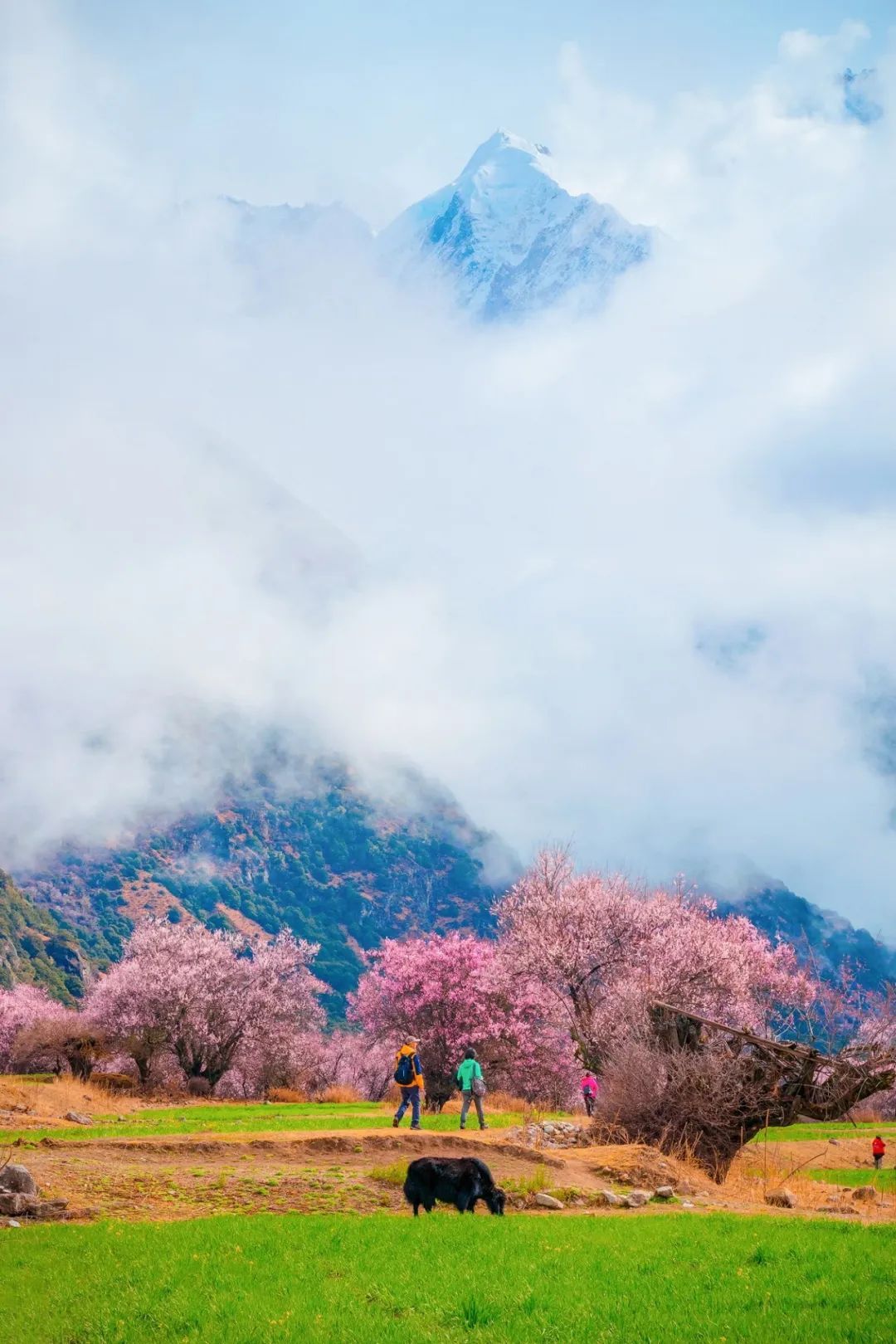 雪山与桃花相映成趣(林芝波密的桃花,以光核桃为主,因果核较光滑而得名,是桃属植物中较原始的一种,摄影师@刘珠明)▼