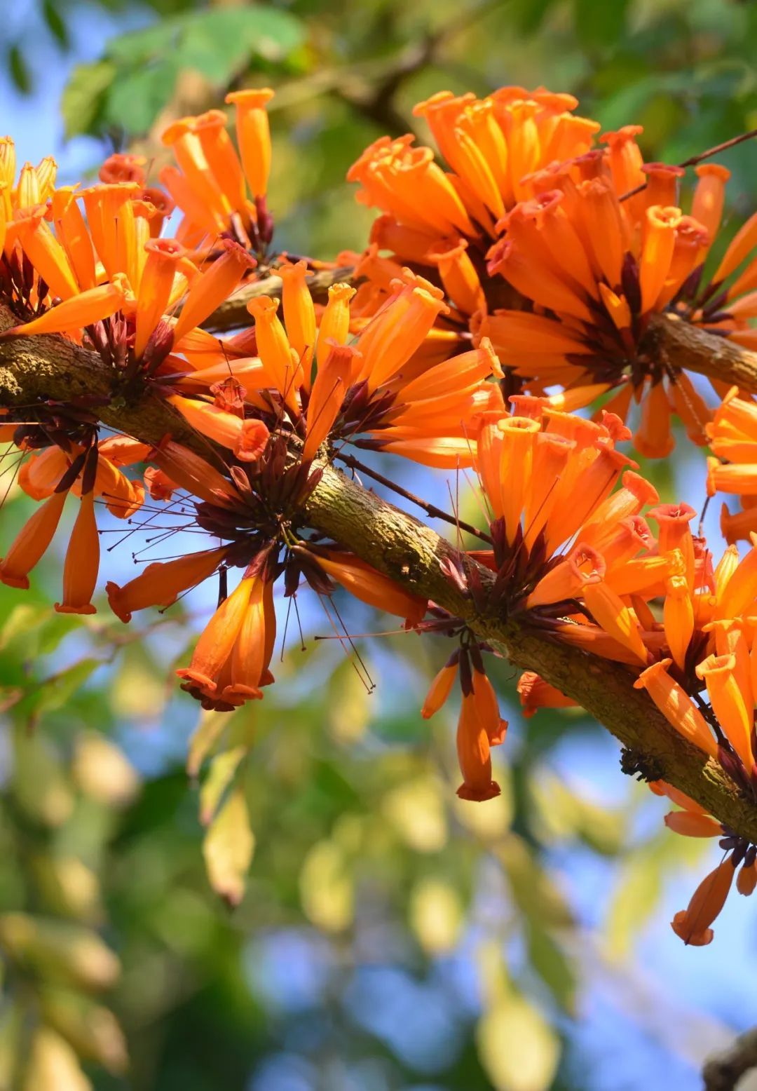 待到2月底、3月初短暂的春天甫一开始便会终结炎炎夏日已是扑面而来(火烧花,分布于云南南部、两广等地的常绿乔木,拥有橙黄色至金黄色的筒状花冠,如同火焰烧灼,摄影师@杨云/中国科学院西双版纳热带植物园)▼