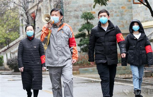 2020年3月2日,黄石市政协党员干部(左二)傅正明、黄石市总工会党员干部邱慧敏(左一)、湖北交投鄂西生态新镇投资有限公司干部傅直超(右二)、湖北交投实业发展有限公司党员干部何晴(右一)一家四人,因武汉、黄石疫情封城不能返岗。就地下沉到居住地鄂州市花湖镇站前社区展开宣传疫情预防、排查登记居民信息、值守社区新冠肺炎疫情防控,并包点帮扶8户特困家庭为他们解决生活上的难题。(湖北日报全媒记者 张鸿 摄)