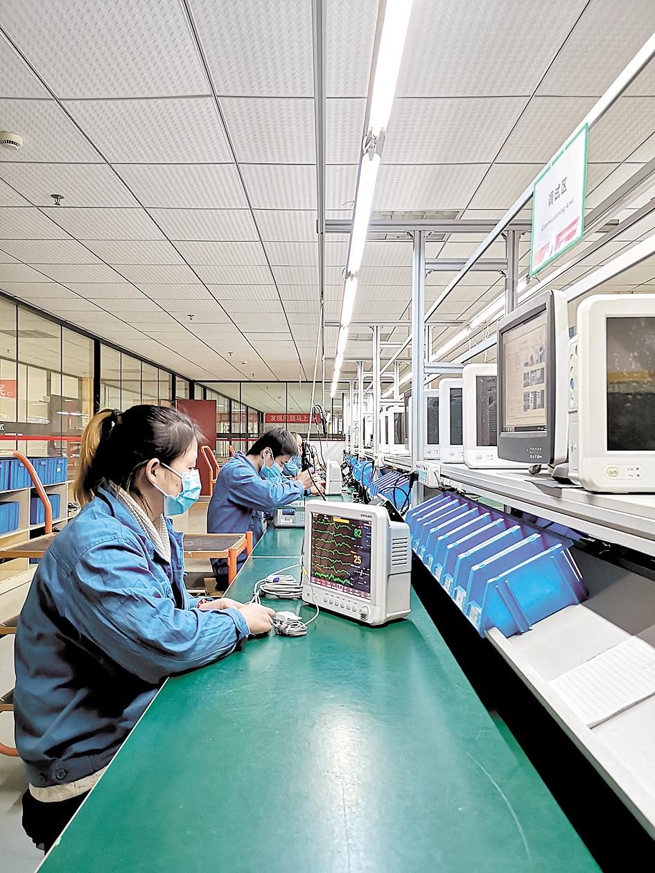 在心电监护仪生产车间,记者看到,工人们在生产、质检、包装等工位上紧张忙碌着。据介绍,目前企业在岗员工87人,人数只有正常状况下的三分之一。