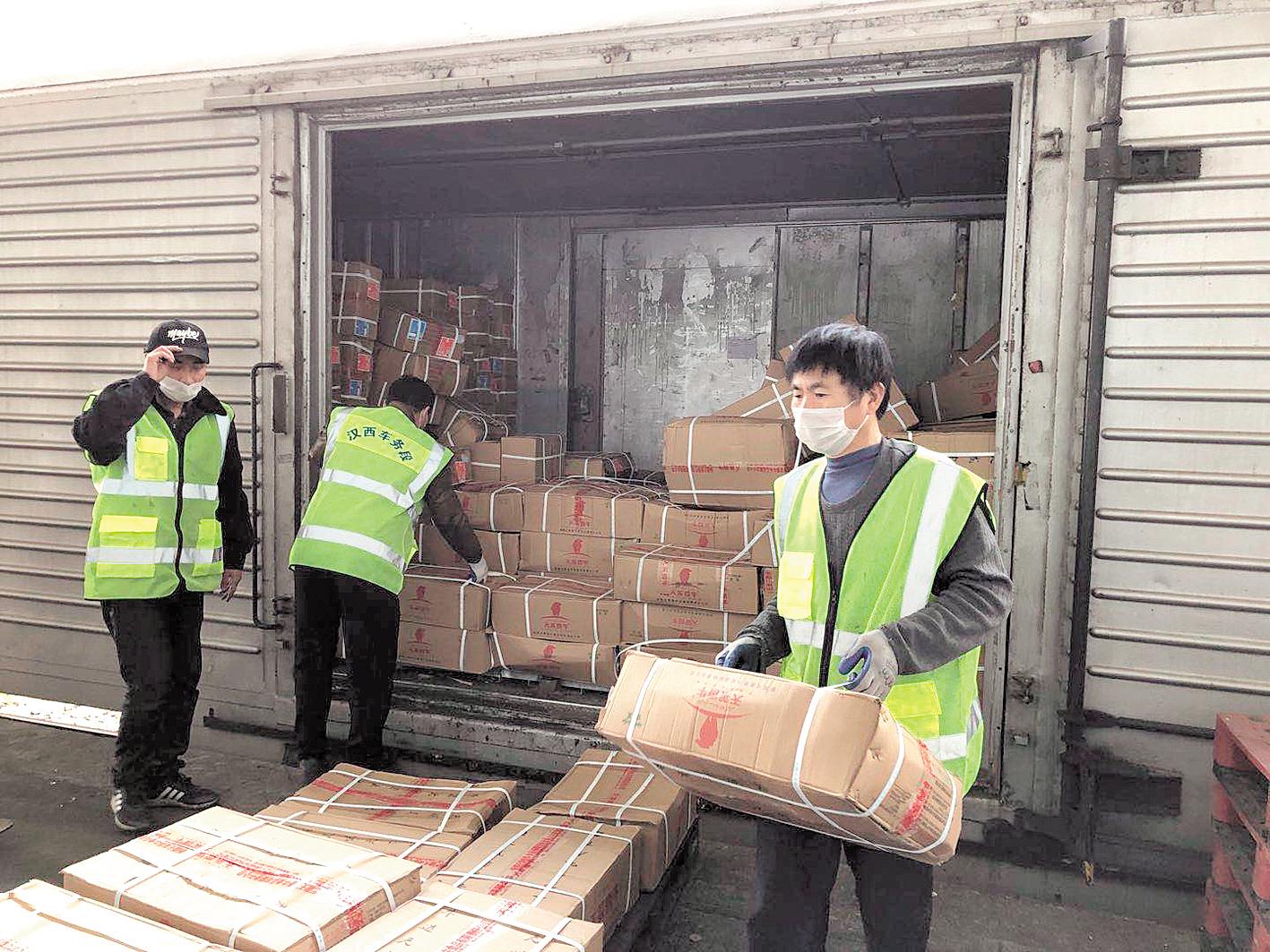 3月4日下午2时,中国铁路武汉局集团公司汉西车务段吴家山站,工作人员将新疆博州党委、政府捐赠的65吨有机牛肉清点分发。该批牛肉价值500万元,于当天凌晨3时抵汉,定向捐赠给武汉大学中南医院、湖北省中医院、湖北省中西医结合医院、某部队医院以及武汉市270家养老机构。