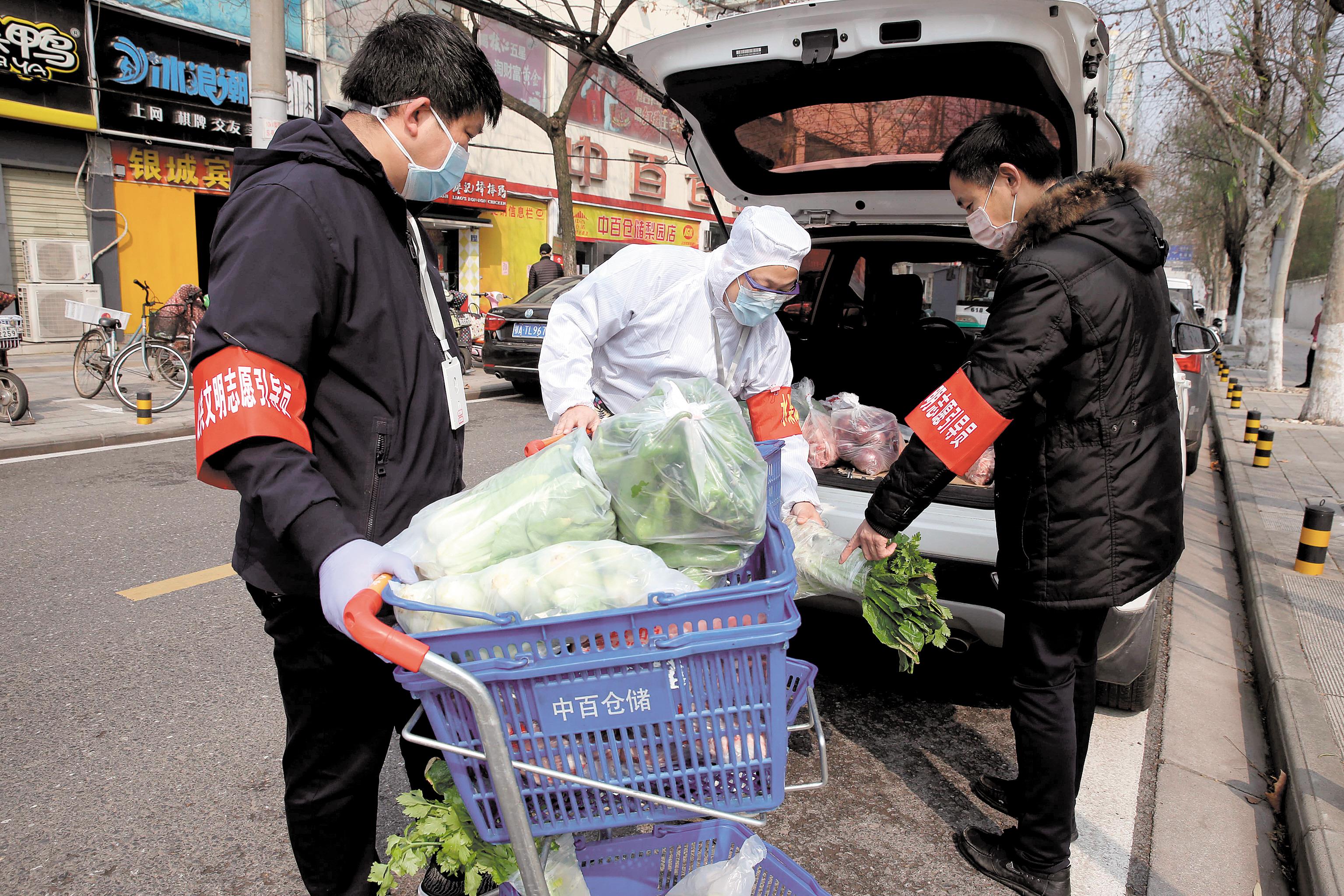 2月25日,陈家敬(中)等5位志愿者帮助东亭小区居民在中北仓储梨园店代购蔬菜、猪肉等生活物资。 (湖北日报全媒记者 梅涛 摄)
