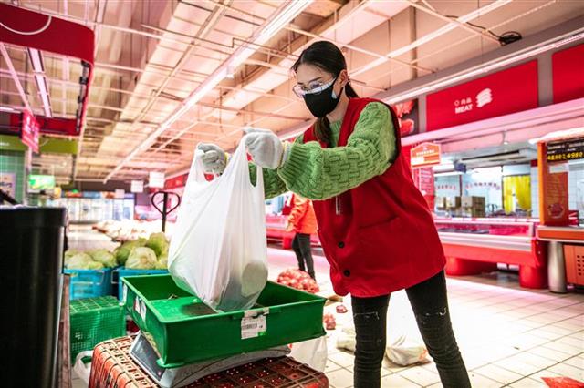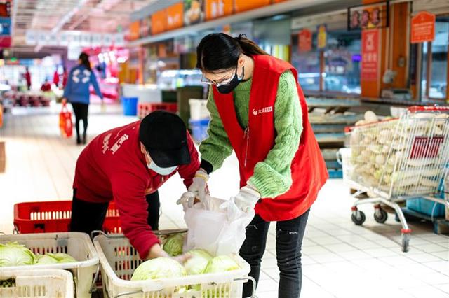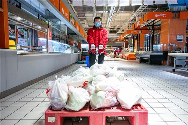 武汉各大小区实行24小时封闭后,超市不再对个人开放,社区团购订单量陡增,全店的人力都会参与社区团购相关工作的支援。作为仓管员的李俊除了下货、搬运之外,忙的时候部门之间还会互相支援,这让夫妻俩有时会搭配到一起工作,携手分拣、打包、搬运,把一包包的“爱心菜”通过公交车送到需要的社区,“我们会互相打气,能多出一份力,就多出一份力。”李俊写道。