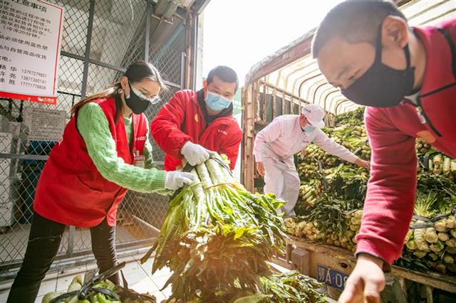 3月4日早上10点,一车从东西湖区运输而来的新鲜莴苣到货了,武汉大润发江汉店的仓管员李俊夫妻俩和几个同事一起忙着下货,面对同事的问候,这对夫妻直摆手表示不辛苦!