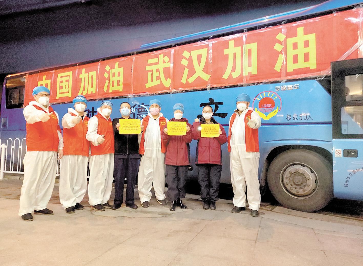 2月21日,当代雷锋郭明义爱心团队一支小分队队员将水果和鸡蛋等捐赠物资送到驰援武汉的辽宁医疗队手中。(新华社发)