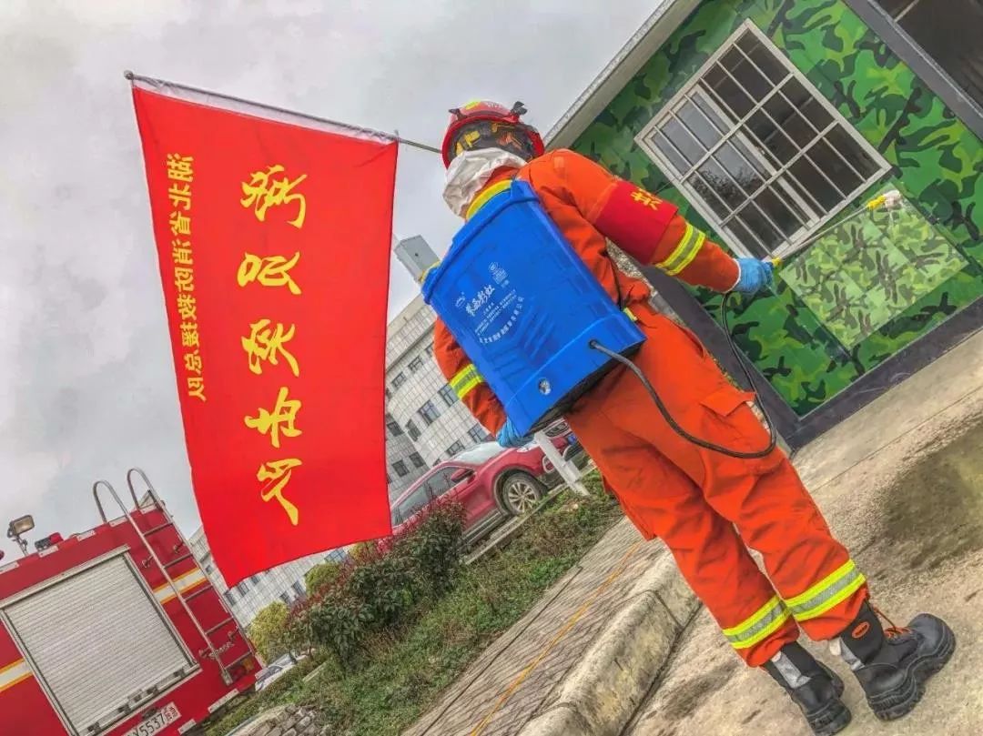 24岁的突击队员唐锋来自襄州区航空路消防救援站,他与同伴们穿戴好装备,仔细检查完防护措施后,便开始了一天的工作。他们五人一列,前往病区外围开展消杀工作。