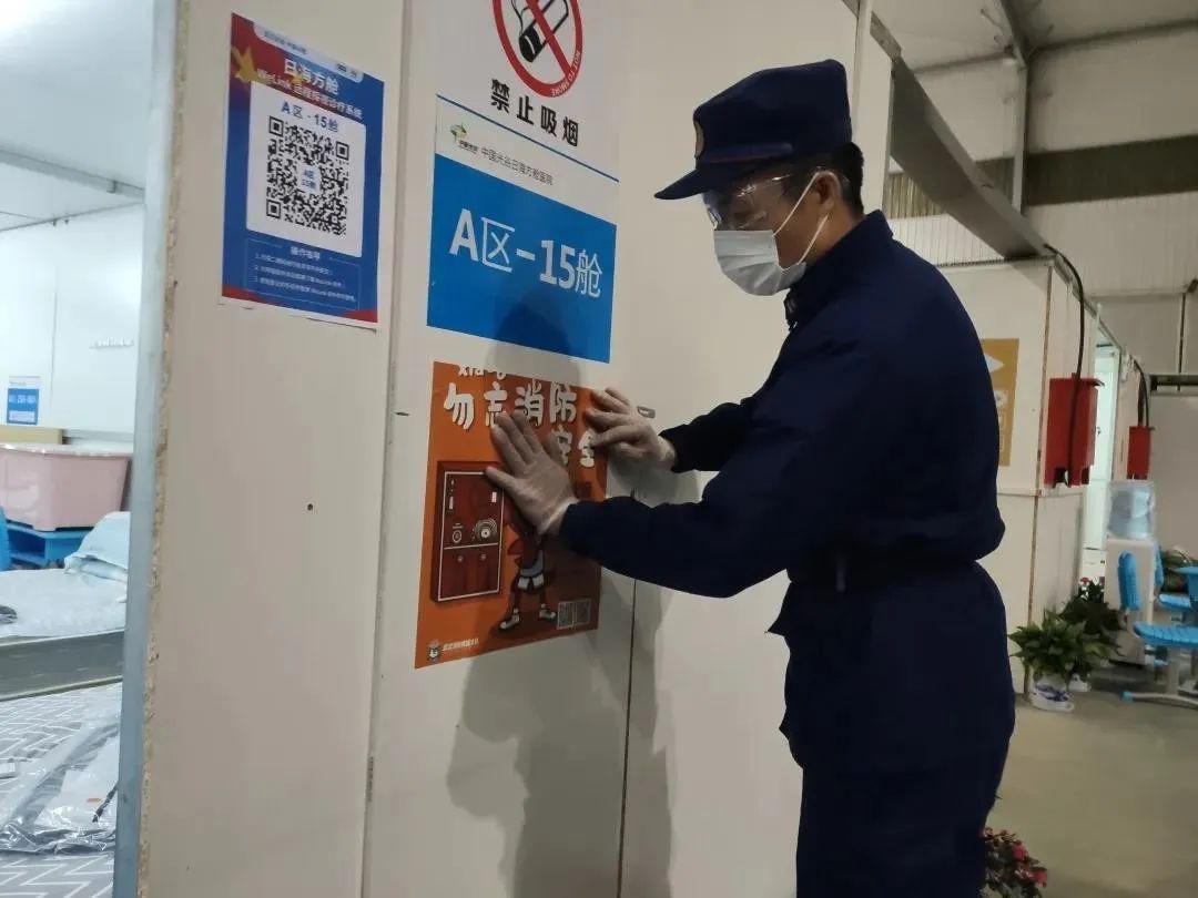 徐震把宿舍规整完毕之后,拿了一叠消防宣传海报,出发了。他边走边说:“方舱医院属于人员密集场所,消防宣传必须深入人心,虽然前期已经贴了3000多张,但昨天巡查发现依然有许多空白地。”