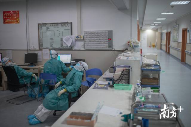 凌晨4点,汉口医院呼吸六病区,忙碌过一轮的护士们坐在一起聊天。