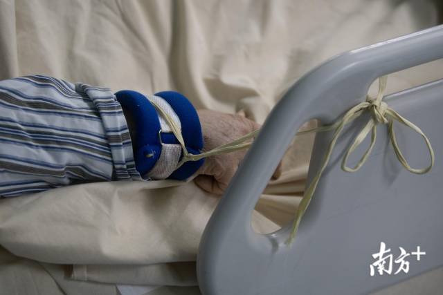 2月28日,3点15分,协和医院西院icu内,护士用绳子绑住一位危重症患者的双手,防止他用手去剥落氧气面罩。
