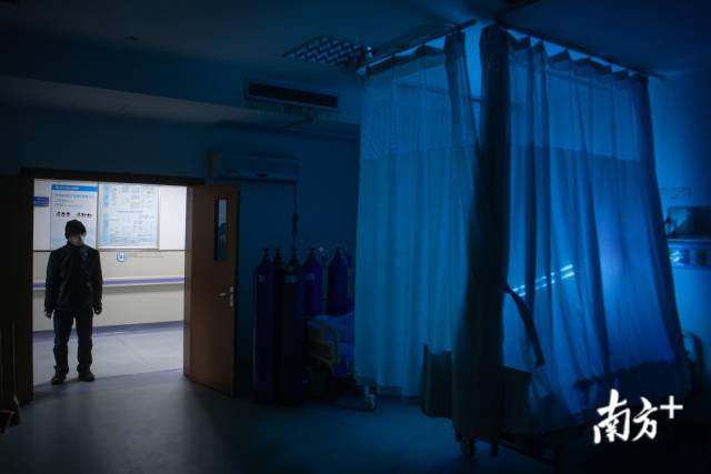 凌晨2点,护士将老人剩下的寥寥衣物用品摊放在床上,拉上床围,用紫外线灯消毒。儿子站在门口久久地盯着,仿佛父亲还在里面。