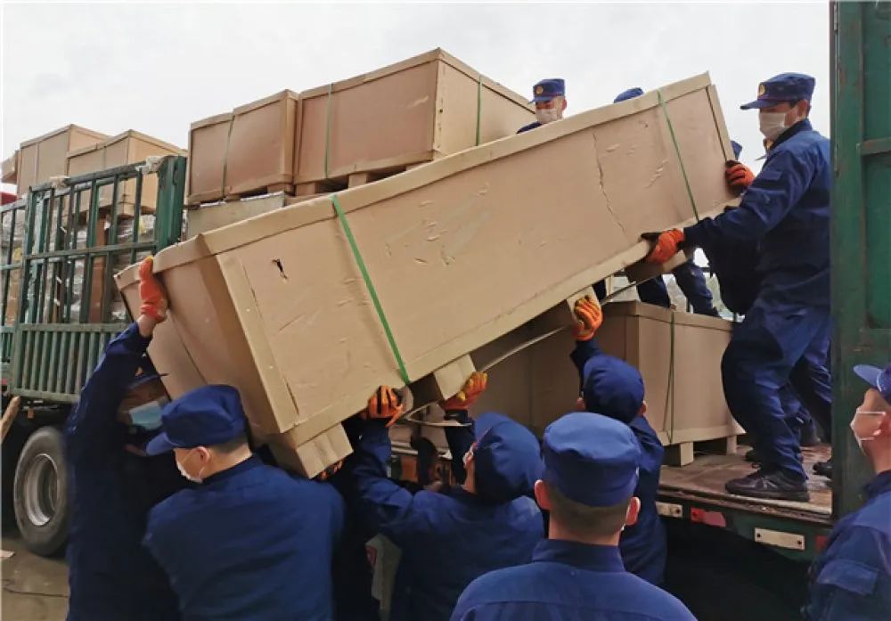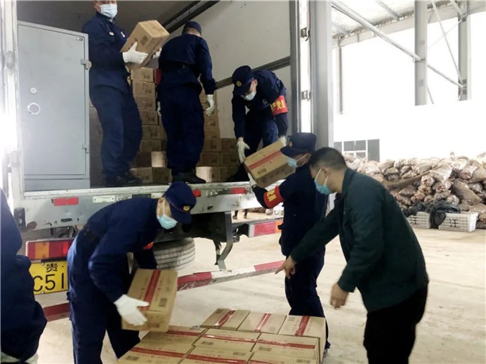 鄂州市消防救援支队调派党员突击队员搬运贵州省支援鄂州的一批物资 (2月22日摄)。新华社发(王涛 摄)