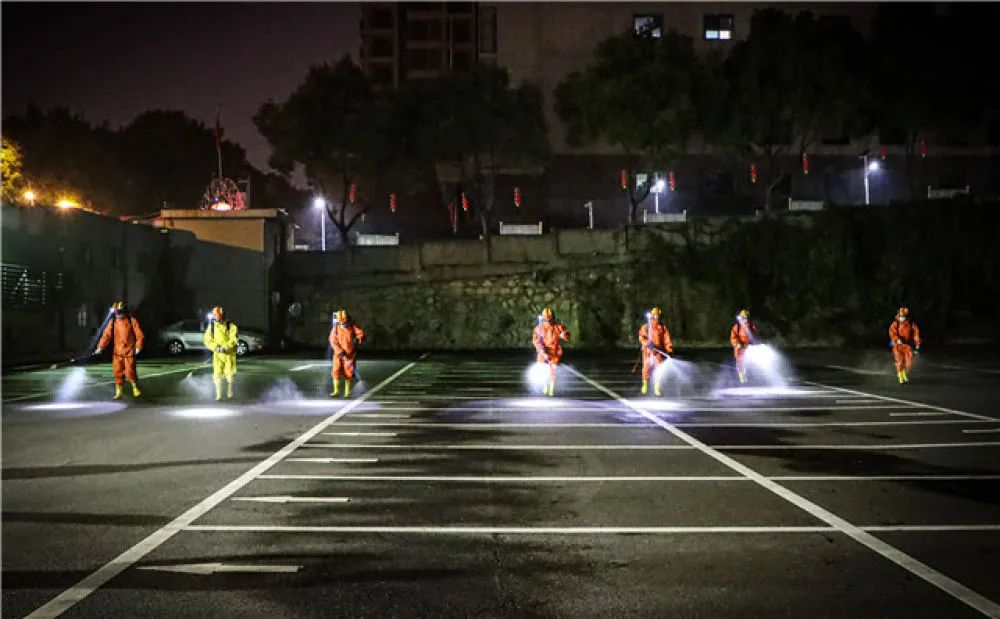 目前,消防救援队伍的公众洗消站、单兵洗消帐篷陆续部署到疫情防控一线,高压细水雾枪、喷洒器具等专业器具配备到一线消防人员,消防车辆已经对楼梯口、垃圾点、污水井道等重点部位进行消毒。