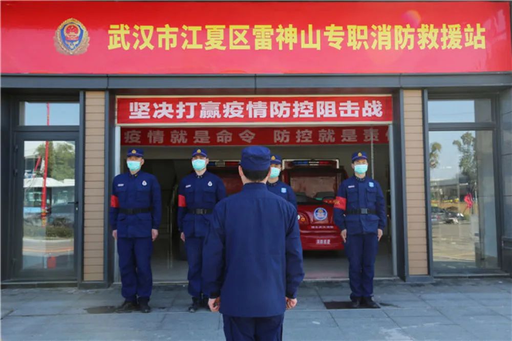 消防人员在雷神山专职消防救援站集合(2月16日摄)。新华社发(何汉求 摄)