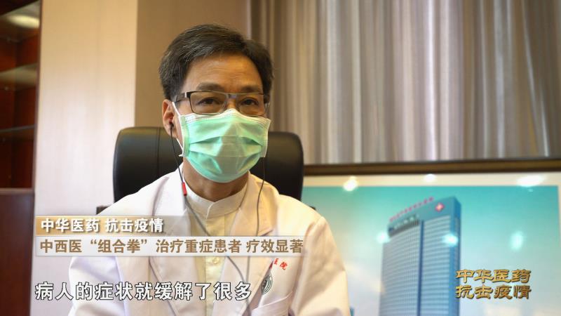 张忠德:几个重症病人恢复得很好,而且时间也不是很长。我今天查的3床是一个86岁的病人,入院时看起来体质很好,但是很喘,全身没劲,血氧也不好,5天没大便,胃口也不好。第一我们给病人吸氧,给他上呼吸机。第二,我们根据病人的中医辨证情况,开出了一些个性化的中药,宣肺、清热、通腹,吃完下去当天晚上他大便就通了,大便通了以后病人的症状就缓解了很多。然后我们再根据病人的重症情况,再给予了他血必净,用来静脉注射的,国家第六版方案里面有的。静脉注射3天以后病人的症状缓解了很多很多,第6天已经不用呼吸机,到第7天病人的血氧就很稳定了。今天是第9天,病人可以自己下床,上厕所,这对病人是非常好的。