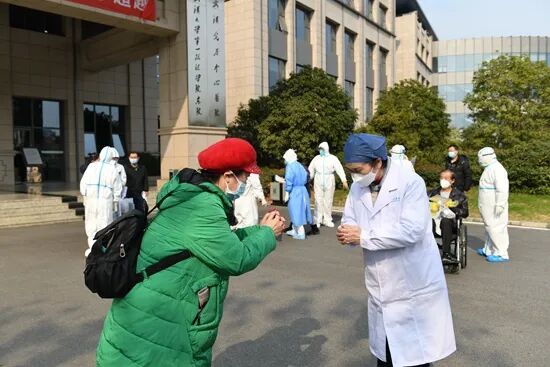 2月24日,19位新冠肺炎重症患者从武汉大学人民医院东院区集体出院。69岁的梅女士向着李兰娟院士鞠躬致谢,李兰娟院士鞠躬还礼。刘瑜/摄
