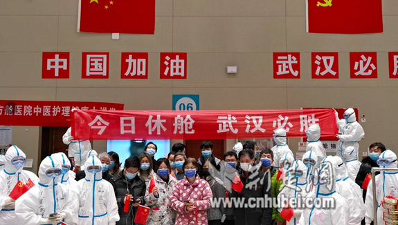 光谷方舱医务人员和最后一批出院患者一起举行休舱仪式