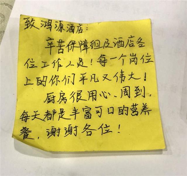 “辛苦保障组及酒店各位工作人员!每一个岗位上的你们平凡又伟大!”重庆市急救医疗中心肝胆科护士曾园园,在便笺贴上留下了真诚感谢。