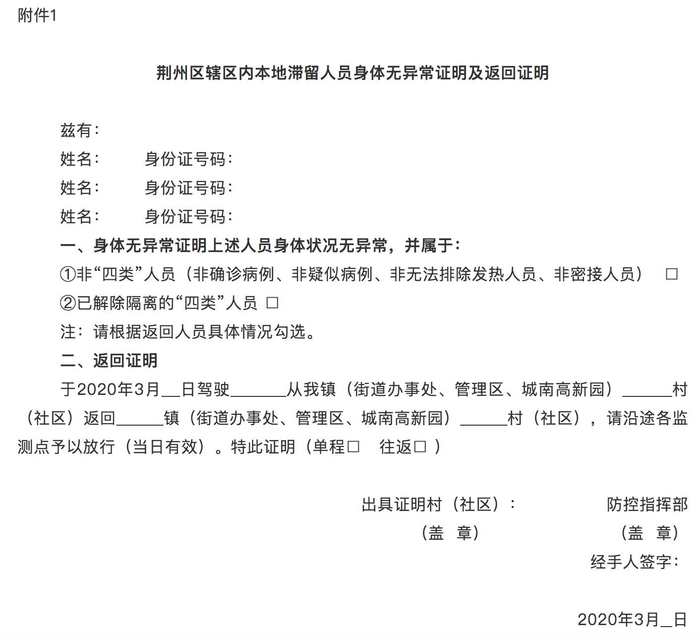 (三)有序返家:3月9日由滞留地所属镇(街道、管理区、高新园)为返家返岗人员统一办理《辖区内滞留人员身体无异常证明及返家返岗证明》(表样附后),并通知返家返岗人员领取证明手续后自行有序返回。