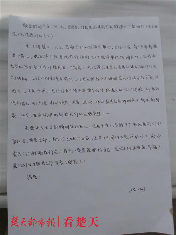 童童妈妈在感谢信里写道:“感谢你们在艰难时刻给了我们无数安慰。一个个让人泪目的瞬间,会在以后的日子激励我们更加热爱生活、热爱生命。”