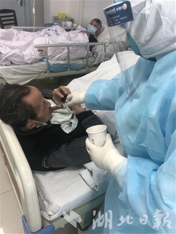金银潭医院收治的新冠肺炎患者大多年纪较大,病情较重。“有的老年患者有老年痴呆症状,还有的患者会因缺氧导致神志不清,生活都不能自理,护理压力很大。”王娟说,穿上防护服进行护理工作格外辛苦,每次护士们穿一件单衣和厚重的防护服进隔离病房,出来全身都湿透了。为节省防护服,六七个小时不喝水、穿尿不湿已是家常便饭。