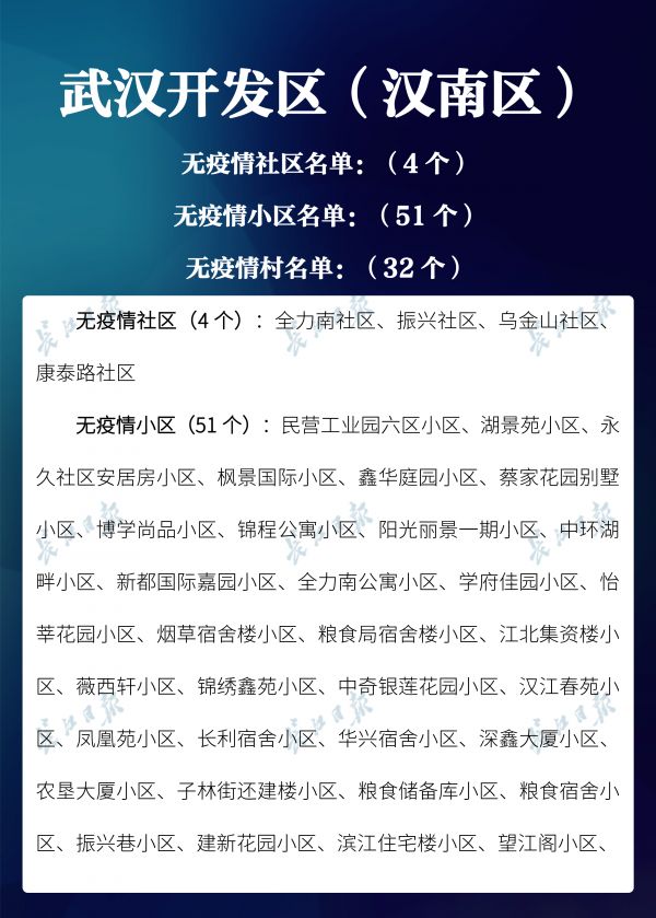 十二、武汉开发区(汉南区)无疫情社区名单:(4个),无疫情小区名单:(51个),无疫情村名单:(32个)