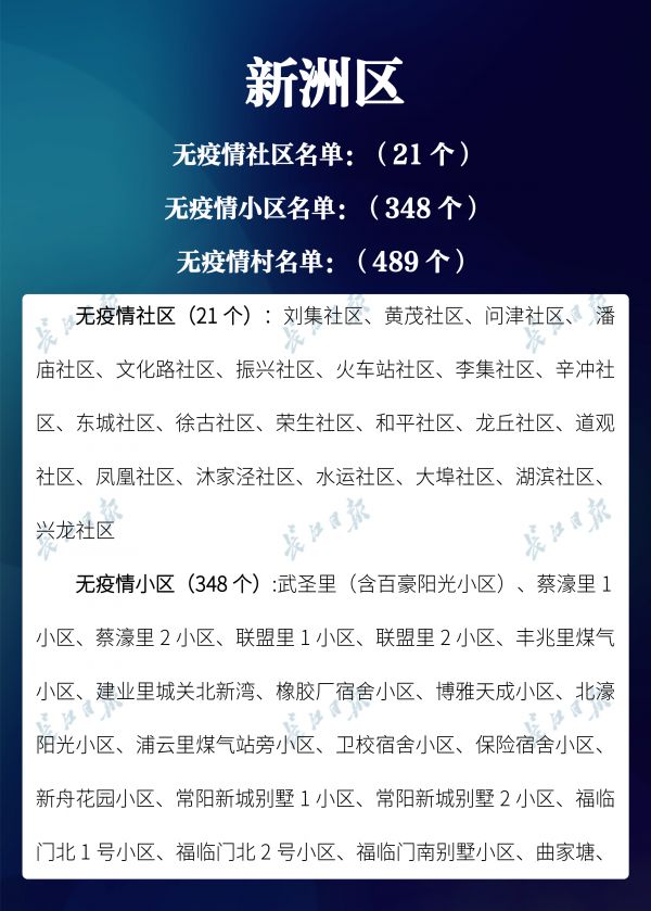 十一、新洲区无疫情社区名单:(21个)、无疫情小区名单:(348个)、无疫情村名单:(489个)