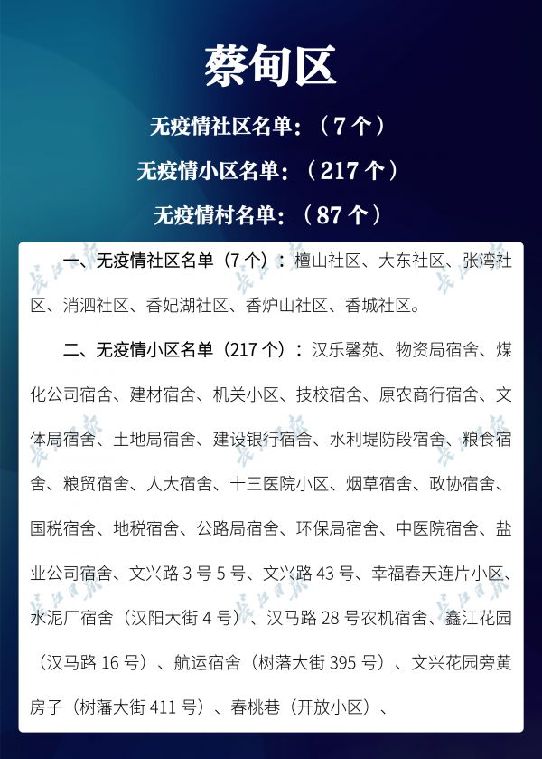 八、蔡甸区无疫情社区名单:(7个),无疫情小区名单:(217个),无疫情村名单:(87个)