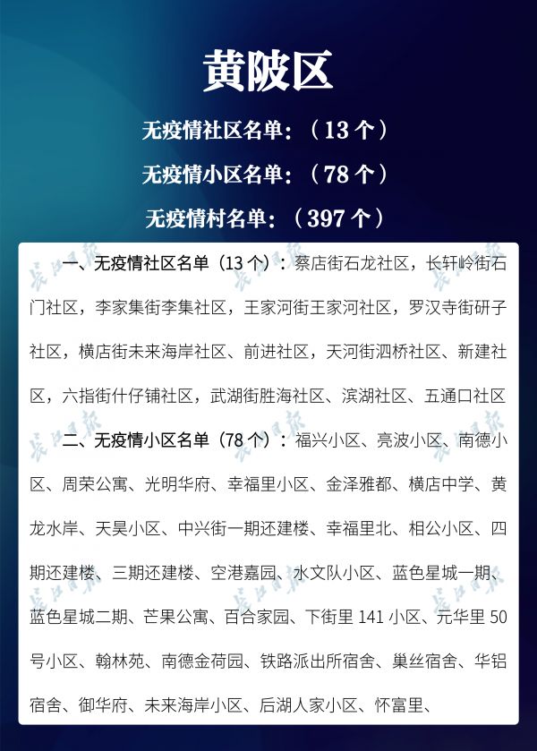 十、黄陂区无疫情社区名单:(13个),无疫情小区名单(78个)、无疫情村名单:(397个)