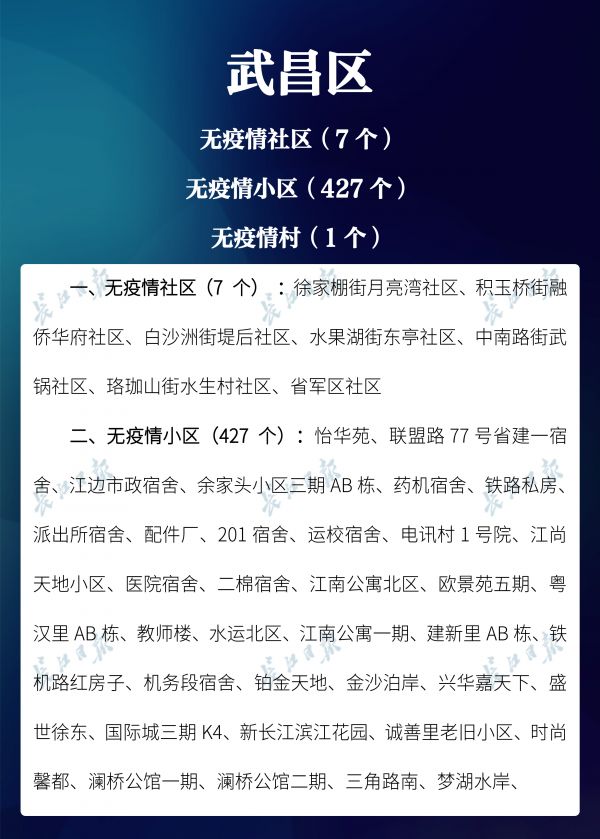 五、武昌区无疫情社区(7 个)、无疫情小区(427 个)、无疫情村(1 个)