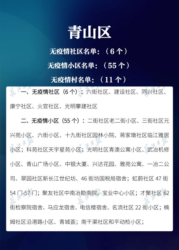 六、青山区无疫情社区名单:(6个),无疫情小区名单:(55个),无疫情村名单:(11个)
