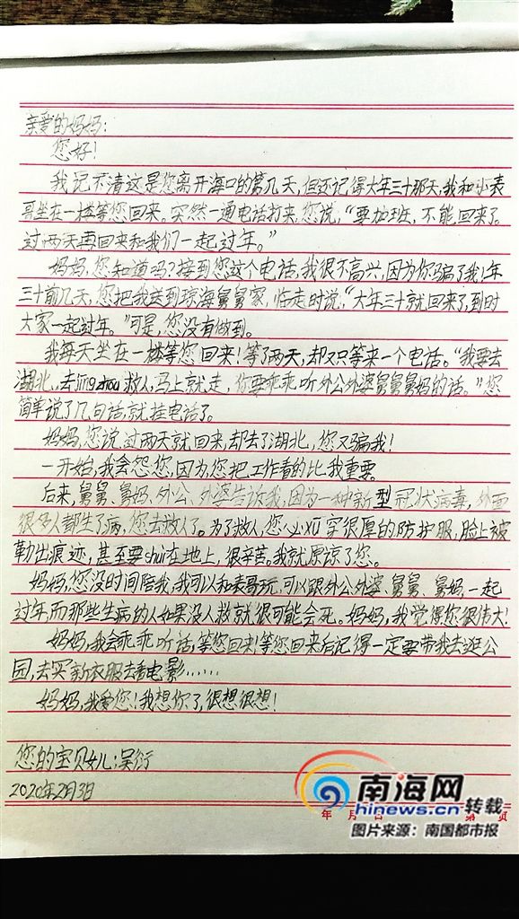 《海口8岁女孩给援鄂护士妈妈写了一封信 妈妈,您又“骗”我》的稿子
