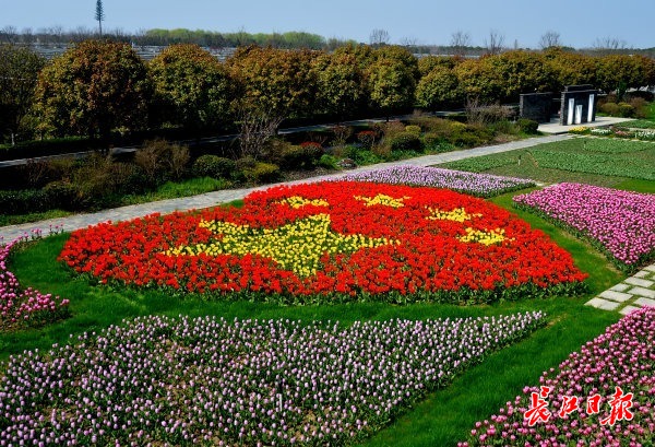 郁金香主题公园内一处红黄郁金香组成的国旗造型。