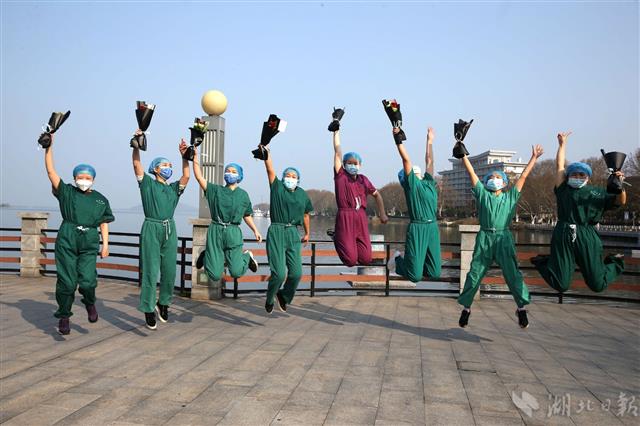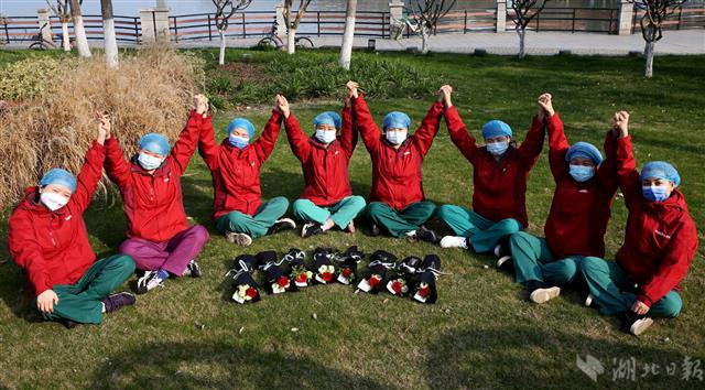 3月7日下午,湖南援鄂第五批医疗队驻金银潭医院的医疗队员,在驻地附近过了一个特殊的“三八”国际妇女节。