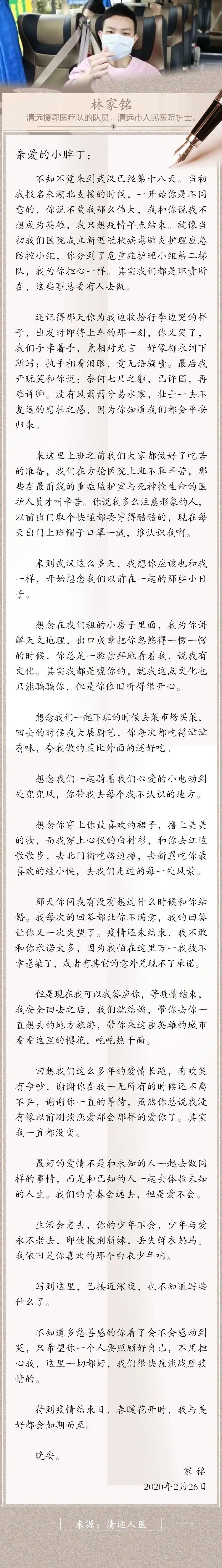 “等疫情结束,我安全回去之后,我们就结婚,带你去你一直想去的地方旅游,带你来这座英雄的城市看看这里的樱花,吃吃热干面。”——2月26日清远援鄂护士林家铭在信中对女友许下婚姻诺言。
