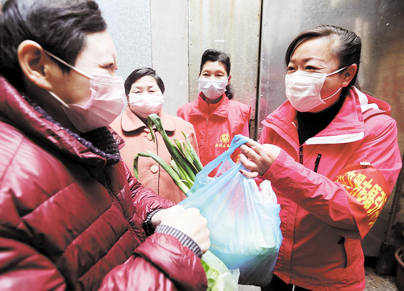 3月7日,武昌起义门社区党员志愿者、党委书记魏玉萍(右)上门为辖区71岁的王婆婆送去生活物资。新冠肺炎疫情发生以来,她始终奋战在社区疫情防控和保障民生物资供应第一线,已连续工作40多天。