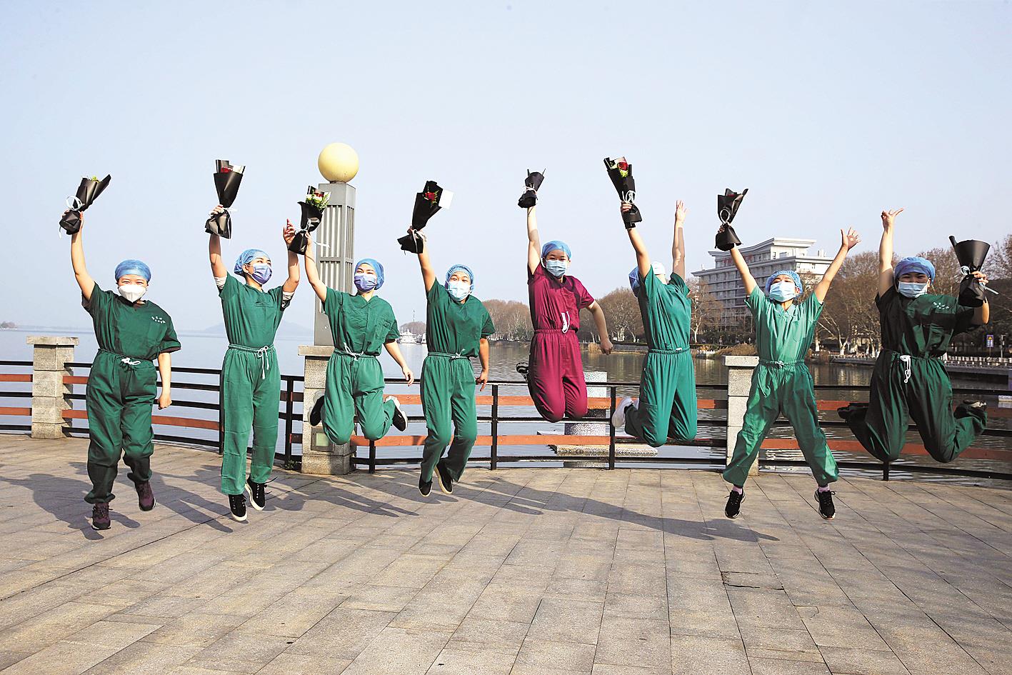 3月7日下午,湖南援鄂第五批医疗队驻金银潭医院的女队员们,在驻地附近过了一个特殊的三八妇女节。当日下午,医疗队为每个轮休的女队员献上一束鲜花,让这些“80后”“90后”白衣天使放松心情、沐浴春光。 (湖北日报全媒记者 梅涛 摄)