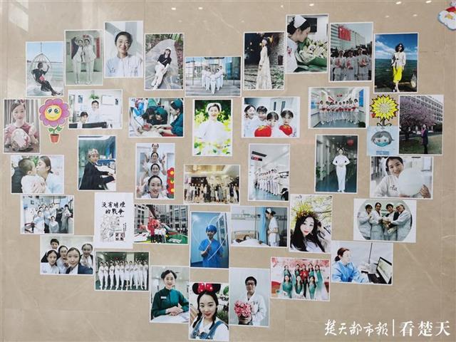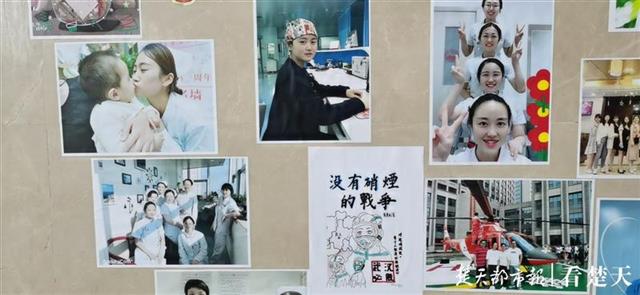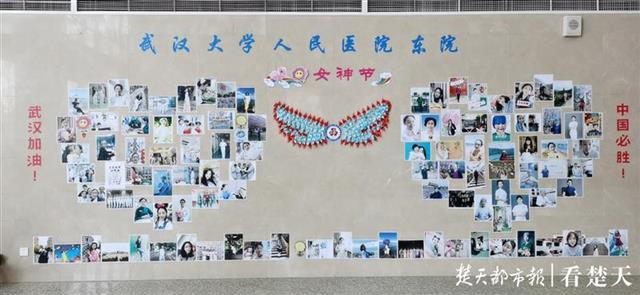 桥的两边,分别是东院区女性医护代表,以及支援东院区10省市12支医疗队的女性医护代表。墙上,不仅贴有驻扎东院支援的李兰娟院士等医护人员的照片,还有医护人员子女创作的手工绘画。