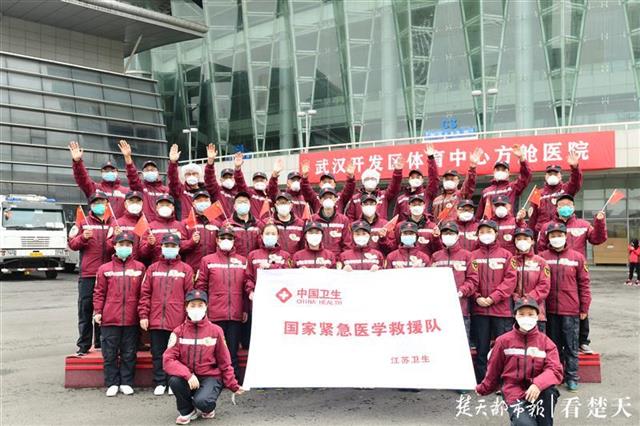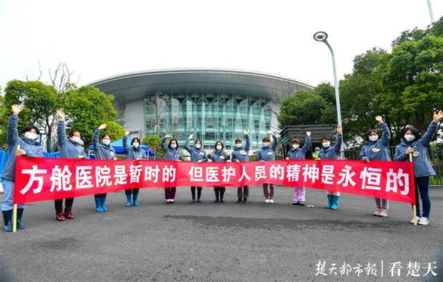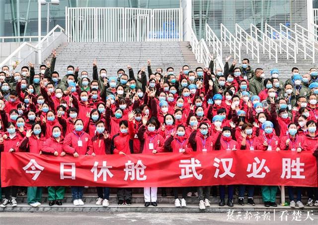 在现场,安徽、江苏援鄂医疗队队员们高兴地合影留念。安徽医疗队一位负责人说:“休舱只是我们工作的暂停,但一定要时时提高警惕,做好自我调节,做好个人防护,随时待命,随时接受国家的调遣,赶赴下一个战场。现场‘武汉必胜’的口号此起彼伏,医护人员们的战斗情绪非常高昴。”