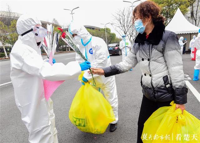 从早上9时开始,武汉经济开发区、洪山区、青山区、武昌区、汉阳区等武汉多个城区来接出院人员的大巴车,停靠在方舱医院出口。一名洪山区工作人员,手捧数十支康乃馨,迎接该区的患者。每位出院的女性,她都会献上一支康乃馨,祝她们节日快乐。