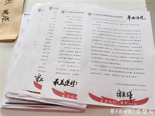楚天都市报记者看到,永守康宁、女儿国中君子、卓尔不凡、战地玫瑰、最美逆行……在这一封封的慰问信上,写着对每名女医护人员的不同赞美之词。原来,这是辽宁医疗队花了近2天时间、详细了解到她们的家庭情况后,再由辽宁援武汉雷神山医院医疗队总指挥、大连医大一院院长、武汉雷神山医院副院长徐英辉,和大连医大一院副院长、武汉雷神山医院副院长尚东一一写上去的。