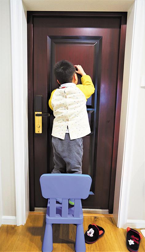 2月3日,6岁的范宇宸站在椅子上,踮脚透过门上的猫眼向外望。小宇宸家住武汉市武昌区中北路,他渴望出门,但长辈们告诉他,为防疫情不能外出。(视界网 范长敏 摄)