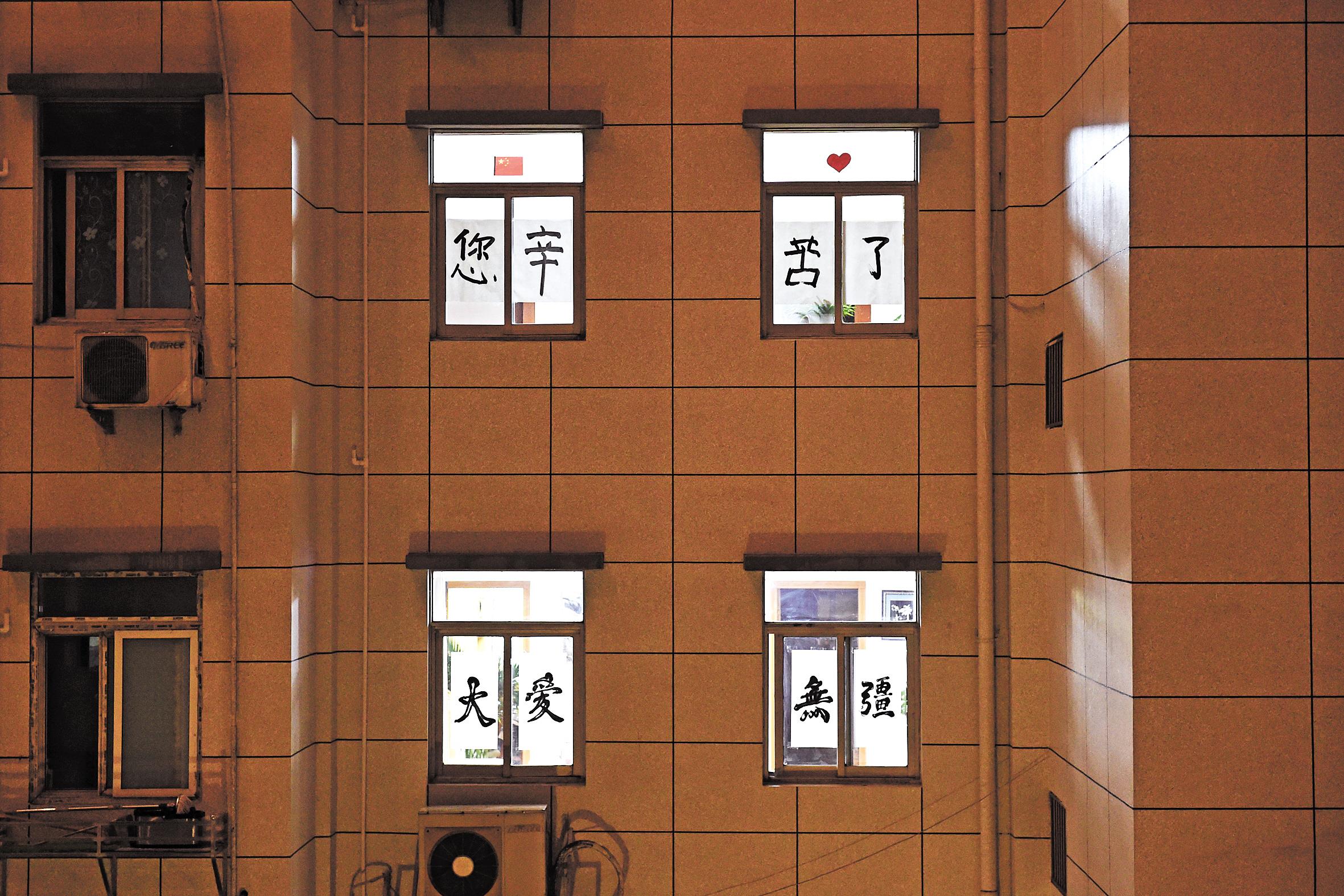 3月8日晚,武汉市武昌区桃山村小区居民在自家窗户贴上手写祝福,向住在相邻锦江之星水果湖店的湖南援汉医护人员致敬。(湖北日报全媒记者 李溪 摄)