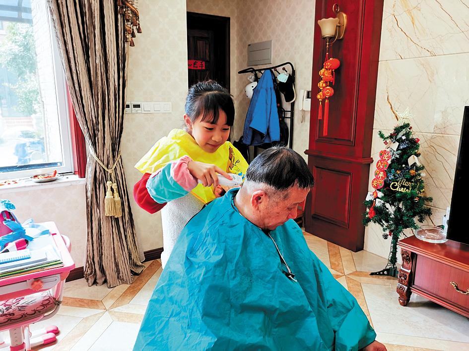 3月5日,家住武汉市洪山区大华南湖公园世家小区的魏沁珊小朋友,学会了用电动推剪帮爷爷理发。 (视界网 王娜 摄)