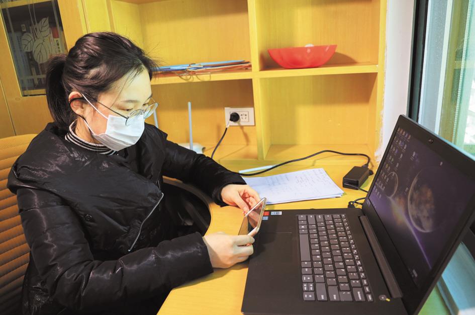 3月4日,秭归县第一实验小学语文教师宋福丹在家中为学生直播网课。(视界网 韩军 摄)