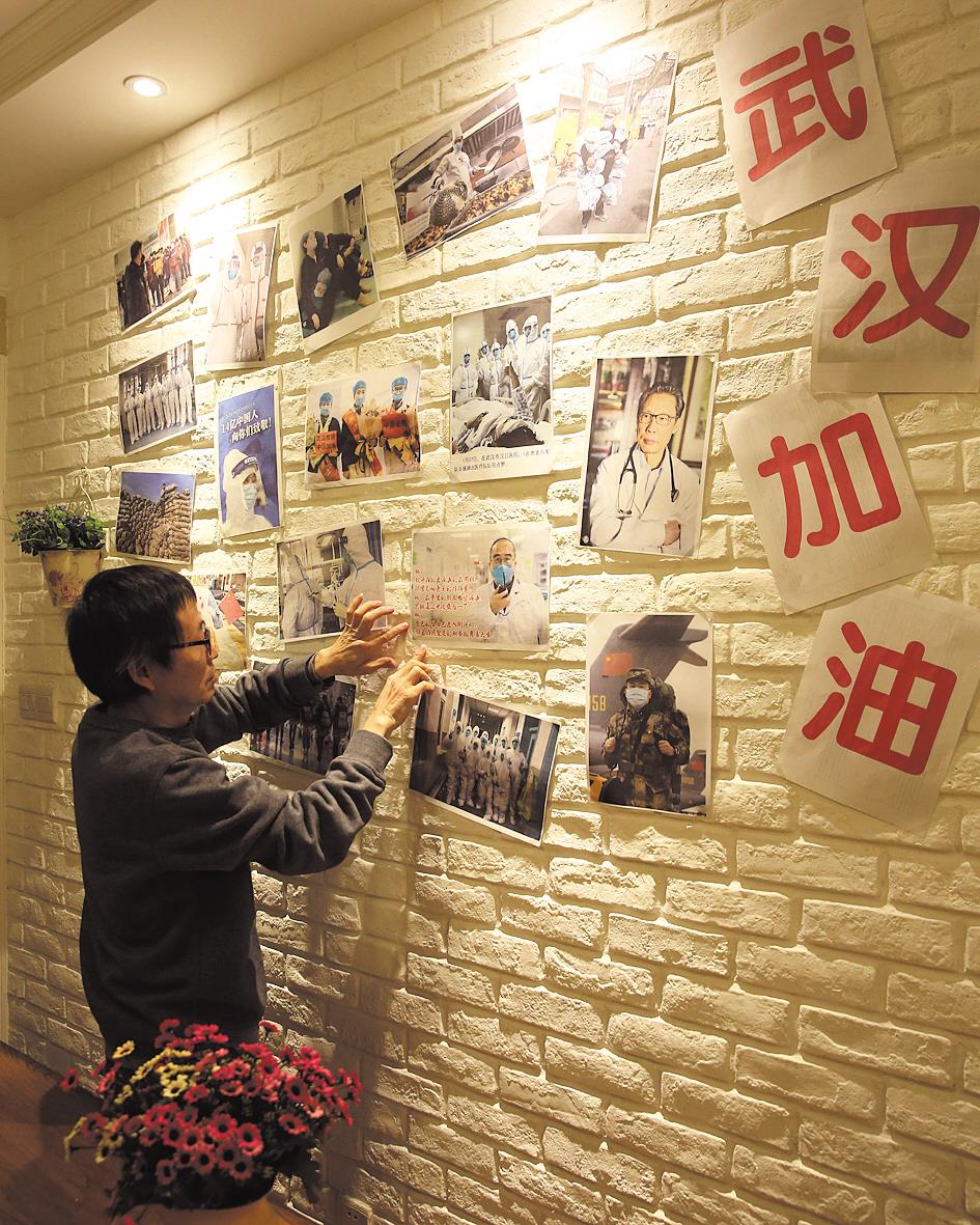 2月28日,武汉东湖生态旅游风景区华侨城社区的袁先生,用打印的抗疫新闻图片,在家里制作“武汉加油”照片墙。(视界网 沈秀勤 摄)