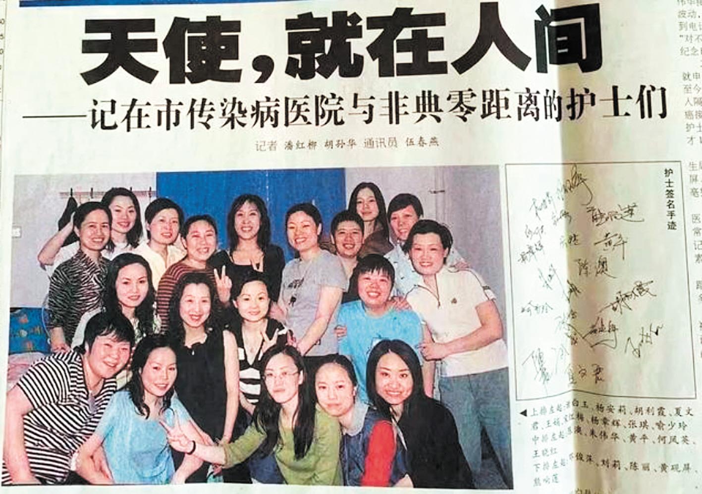2003年5月,“非典”疫情大为好转,包括她们4位在内,武汉市传染病医院19位勇斗病魔的护士摘下口罩,留下一张合影。
